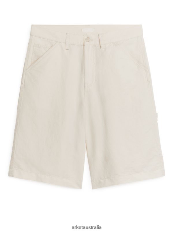 Carpenter-inspired shorts crafted from a linen/cotton blend. Cut at a knee-length. Featuring a classic 5-pocket upper with patch pockets and hammerloop added at legs. Button closure and zip fly.