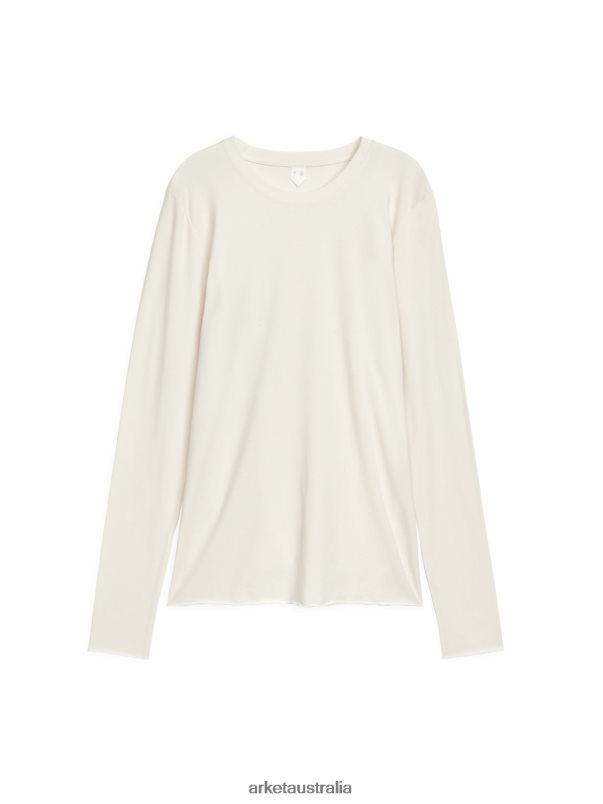 Long-sleeved top with a soft and stretchy feel. A round-neck style with raw edges at bottom hem and at end of sleeves.